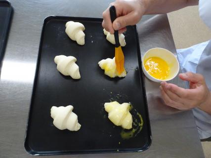パン作業では、生地への卵塗り、ゴマ付けを行っています。